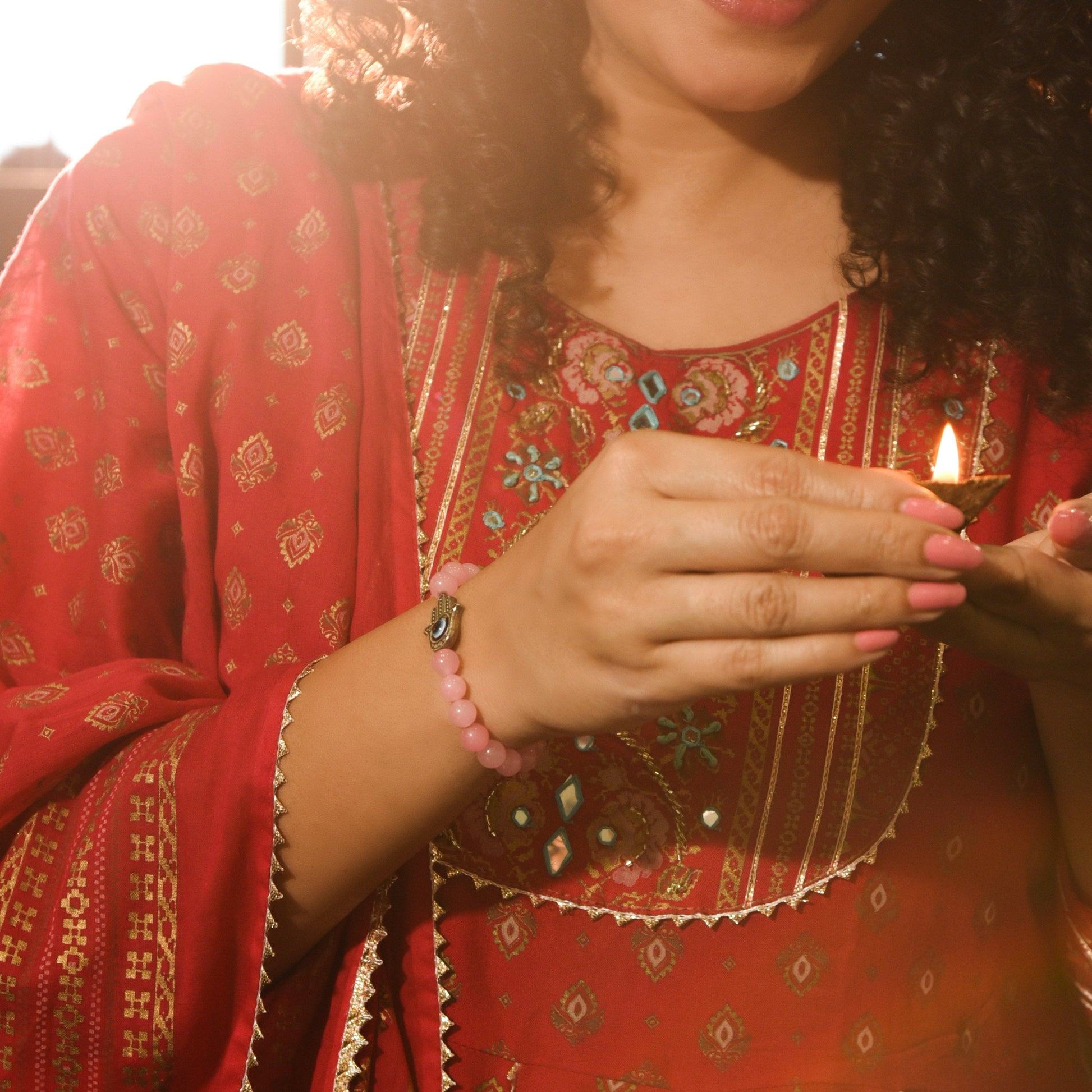 Love Attraction with evil eye hamsa bracelet is a beautiful pink crystal known for its gentle and loving energy. Its a popular choice for those looking to attract love, strengthen relationships, and promote self-love.