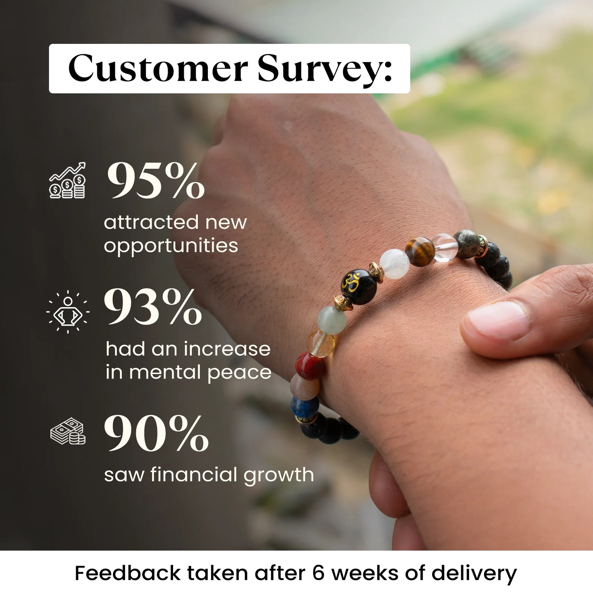 Bring harmony and prosperity into your life with the Navgrah Shanti Bracelet with FREE Raw Selenite Plate. This bracelet is designed to balance all nine planets with the power of nine gemstones – Sunstone, Moonstone, Red Jasper, Green Aventurine, Citrine, Clear Quartz, Pyrite, Lapis Lazuli, and Tiger Eye – along with lava beads and an Om bead for peace and grounding. It helps attract money, reduce planetary doshas, and bring mental clarity. Starting to wear this bracelet during Navratri is considered highly auspicious, as it enhances its energy and blessings.