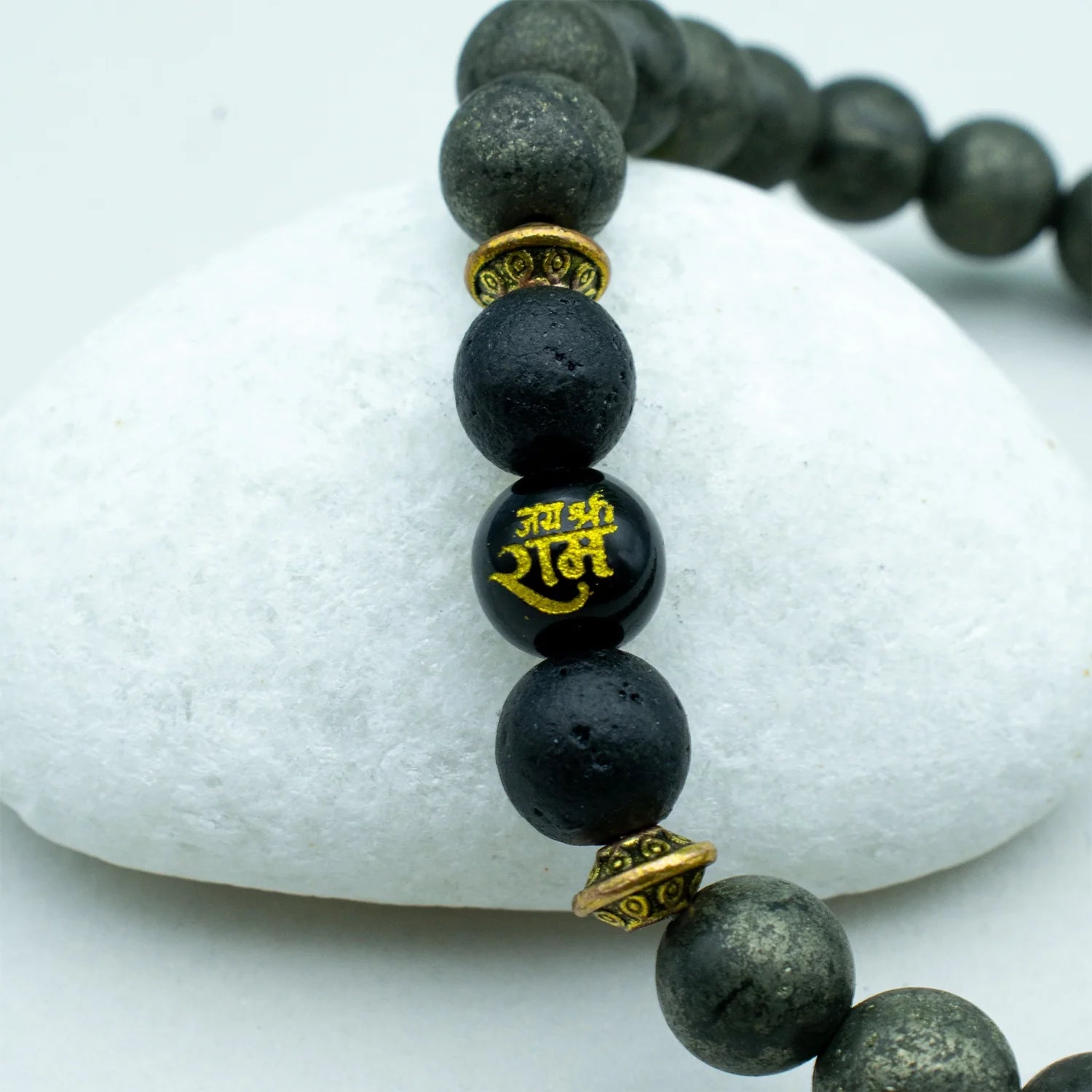 Attract money and blessings of lord ram. This bracelet combines the money-attracting power of 100% original Raw Pyrite with the blessings of a Ram naam bead, peace and inner calm of Lava beads.