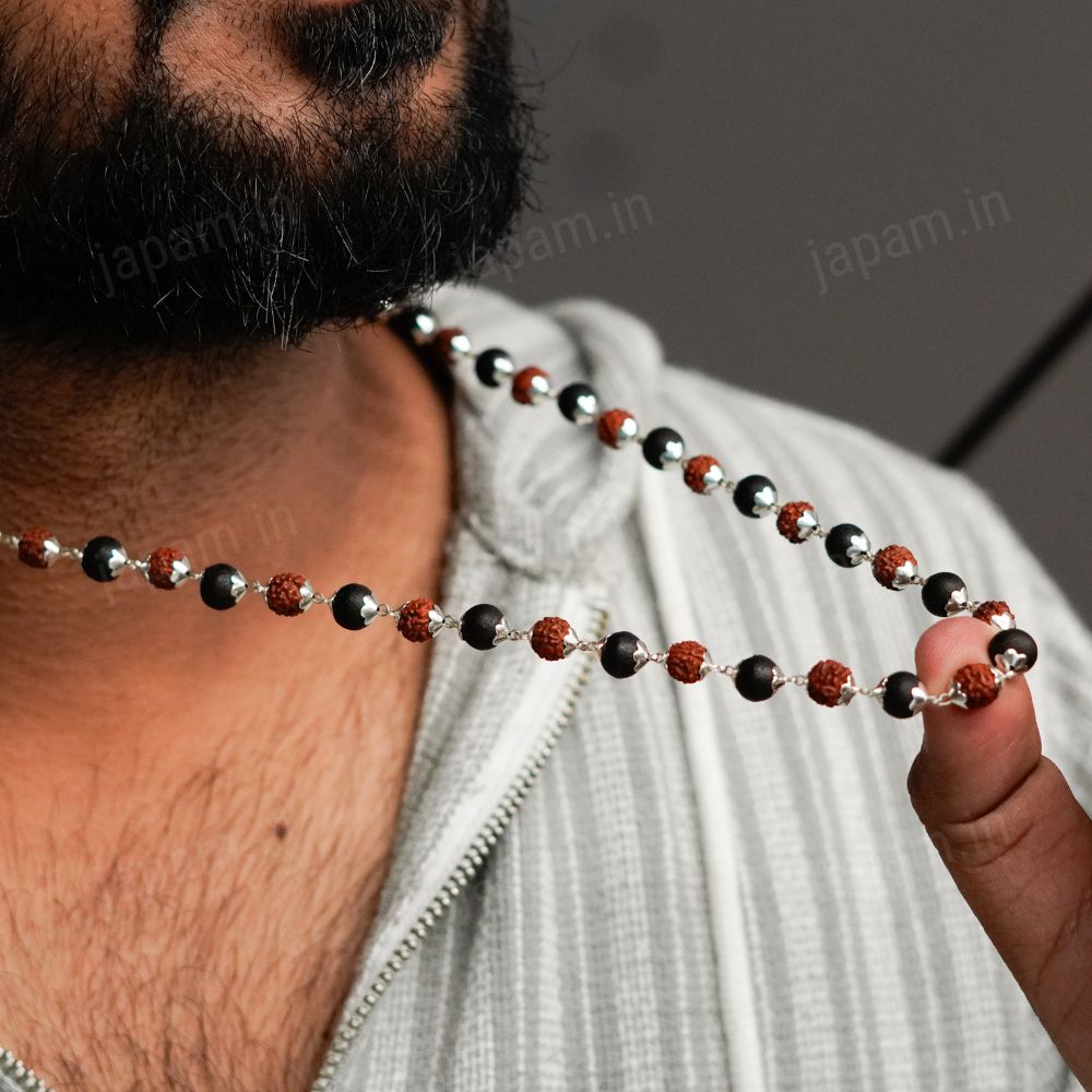 Embrace Divine Protection and Grace with Our Silver Plated Divya Rudraksha Karungali Mala.