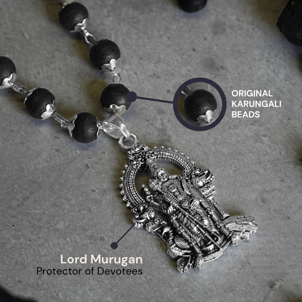 Embrace divine strength and spiritual grounding with our Karungali Necklace with Murugan Pendant.
